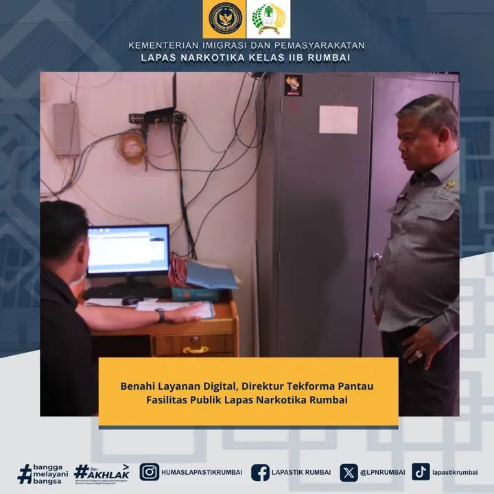 Pekanbaru, Jurnalhukrim.com – Penerapan teknologi informasi dan layanan publik di Lembaga Pemasyarakatan (Lapas) Narkotika Kelas IIB Rumbai mendapat perhatian khusus dari Direktur Teknologi Informasi dan Kerja Sama Pemasyarakatan (Tekforma) Direktorat Jenderal Pemasyarakatan (Ditjenpas), Maulidi Hilal, Jum’at (21/10). Direktur Tekforma beserta tim berkunjung untuk memantau implementasi sistem digital dan fasilitas layanan publik bagi masyarakat dan Warga Binaan.