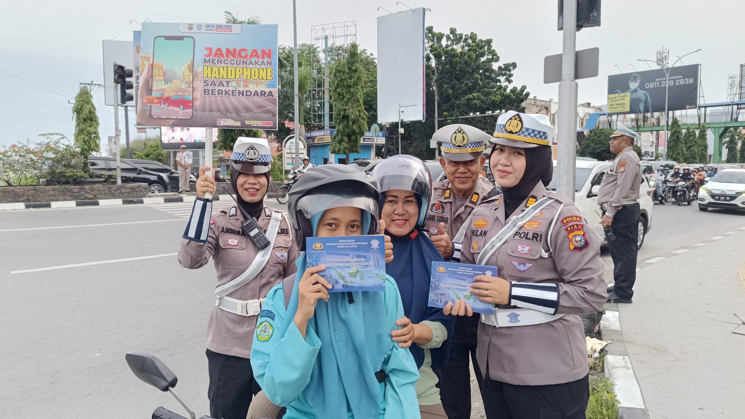 Terpantau di lokasi kegiatan, puluhan helm dibagikan kepada pengendara roda dua, serta Tumbler dan brosur tata tertib berlalu lintas, dan personel Ditlantas Polda Riau sendiri juga menggunakan alat peraga Gimik-gimik yang bertuliskan pesan edukasi Kamseltibcarlantas. Selama Kegiatan berlangsung berjalan tertib aman dan lancar. (***)