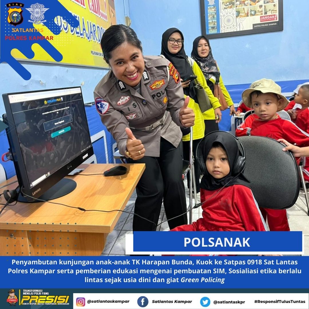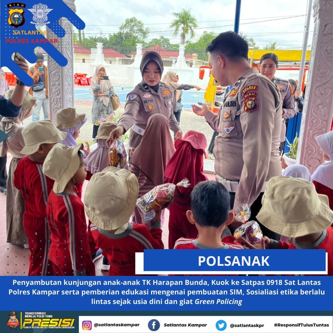 KAMPAR, Jurnalhukrim.com – Satuan Lalu Lintas (Satlantas) Polres Kampar menggelar kegiatan Dikmas Lantas Polisi Sahabat Anak (Polsana) dan Green Policing dengan menyambut kunjungan anak-anak TK Harapan Bunda, Kuok ke Satpas Sat Lantas Polres Kampar, Sabtu (24/01/2026).