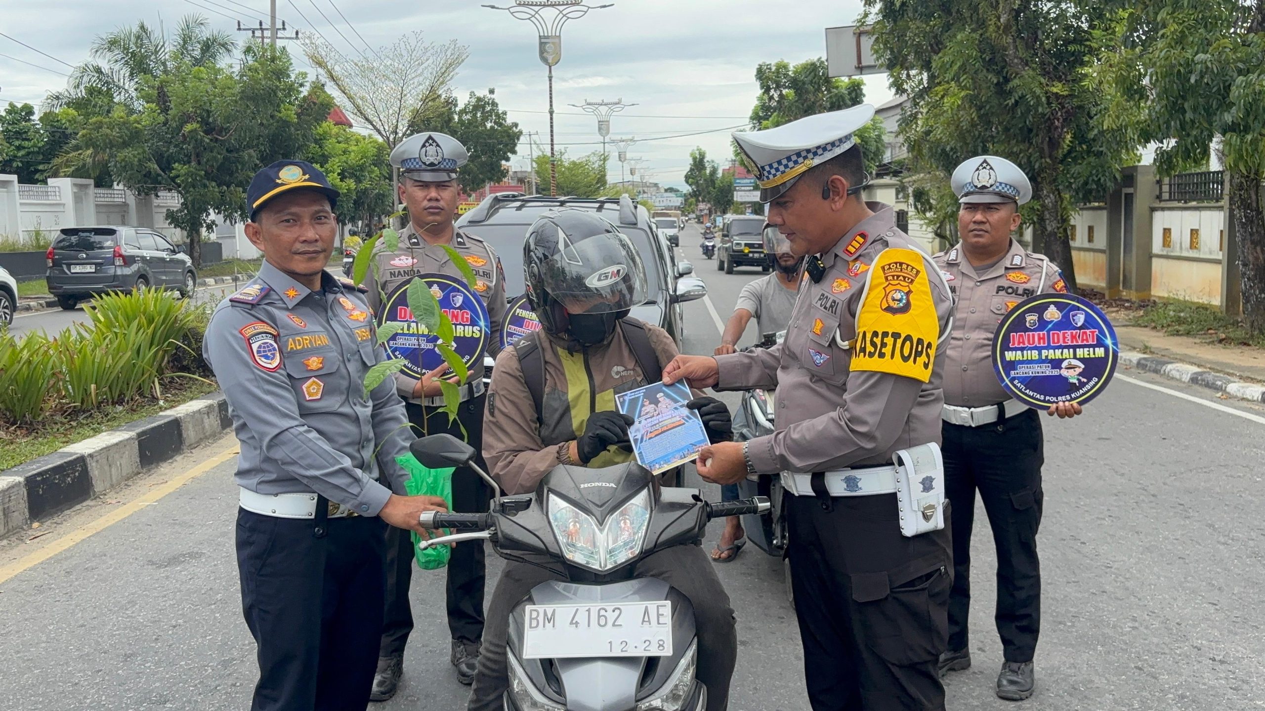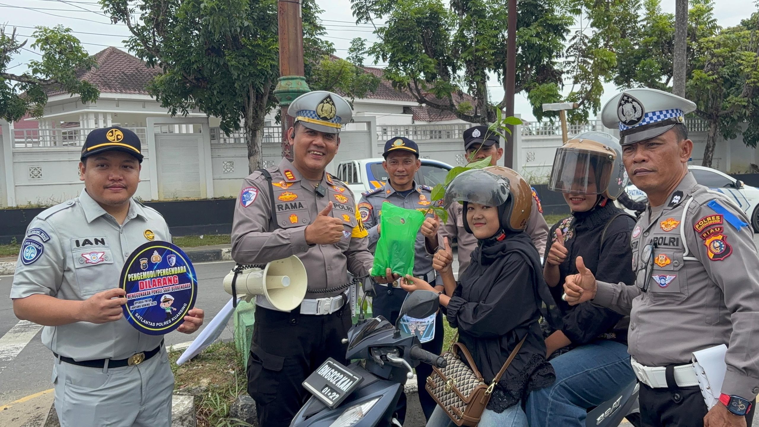Kuantan Singingi, Jurnalhukrim.com – Bertepatan Hari Ke – 5 Operasi Zebra Lancang Kuning 2025 Satlantas Polres Kuansing Bersama Stakeholder Sebar Bibit Pohon Kepada Pengendara yang Tertib Lalu Lintas, di Jalan Proklamasi Kelurahan Sei.Jering Kec.Kuantan Tengah Kab.Kuansing. Jum’at (21/11/25)