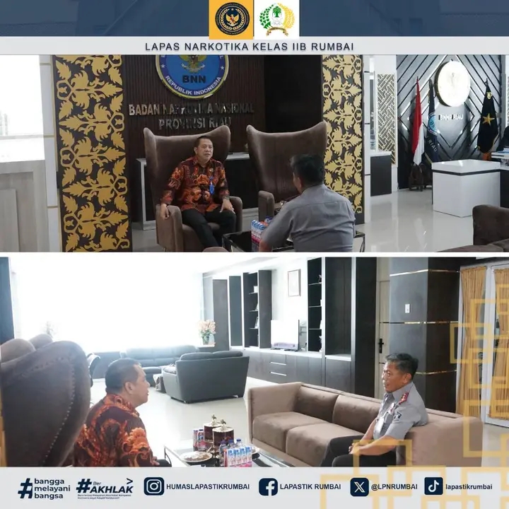 Disambut dengan baik di ruangan Kepala BNNP Riau, Brigjen. Pol. Christ Reinhard Pusung, S.I.K., M.Han., M.H. Kepala Lapas Narkotika Rumbai menyampaikan bahwa kedatangan Lapas Narkotika Rumbai sebagai bentuk mempererat tali silaturahmi antara Lapas Narkotika Rumbai dengan BNNP Riau.