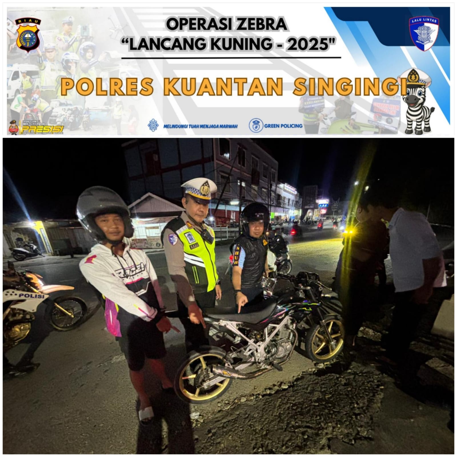 KUANTANSINGINGI, Jurnalhukrim.com — Polres Kuantan Singingi bersama Forum Lalu Lintas dan Angkutan Jalan (LLAJ) Kabupaten Kuansing melaksanakan kegiatan penindakan terhadap pelanggaran lalu lintas berupa penggunaan knalpot tidak sesuai spesifikasi (knalpot brong) serta aksi balap liar pada Sabtu malam, (22/11/2025).