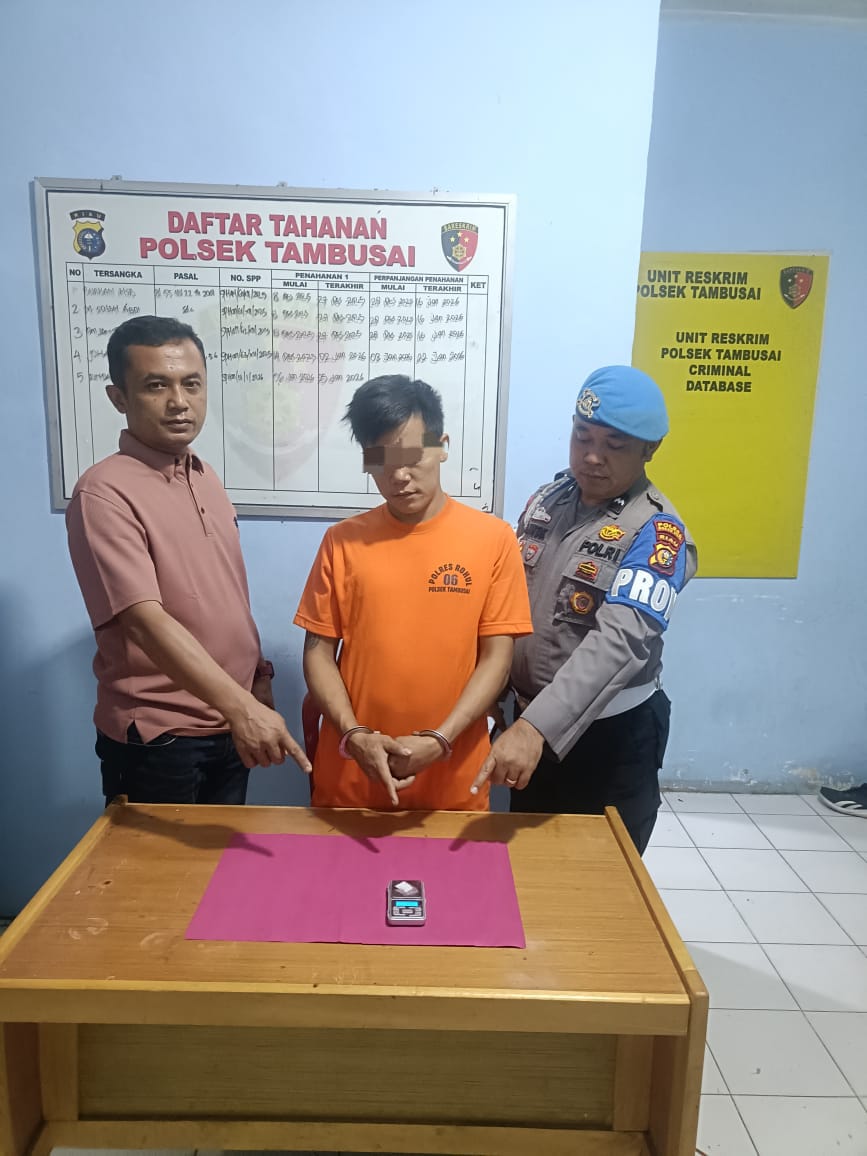 “Setelah dilakukan penyelidikan, pada Jumat malam petugas berhasil mengamankan seorang pria di sebuah rumah di Desa Tambusai Barat. Saat dilakukan penggeledahan badan, petugas menemukan satu paket plastik klip bening berukuran kecil yang diduga berisi narkotika jenis sabu di kantong celana sebelah kiri pelaku,” ujar Kapolsek.