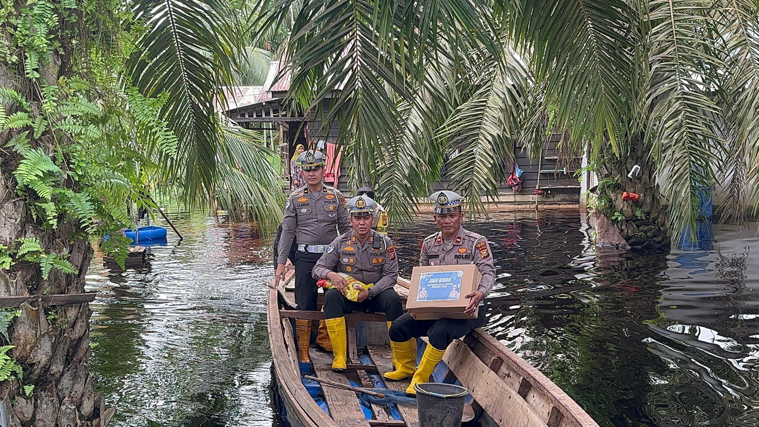 Untuk menanggulangi situasi ini, Kasat Lantas AKP Kaliman Siregar bersama stafnya menggunakan perahu untuk menyambangi rumah kedua keluarga tersebut. Dengan sigap, mereka memberikan bantuan sembako kepada warga yang terisolasi tersebut.