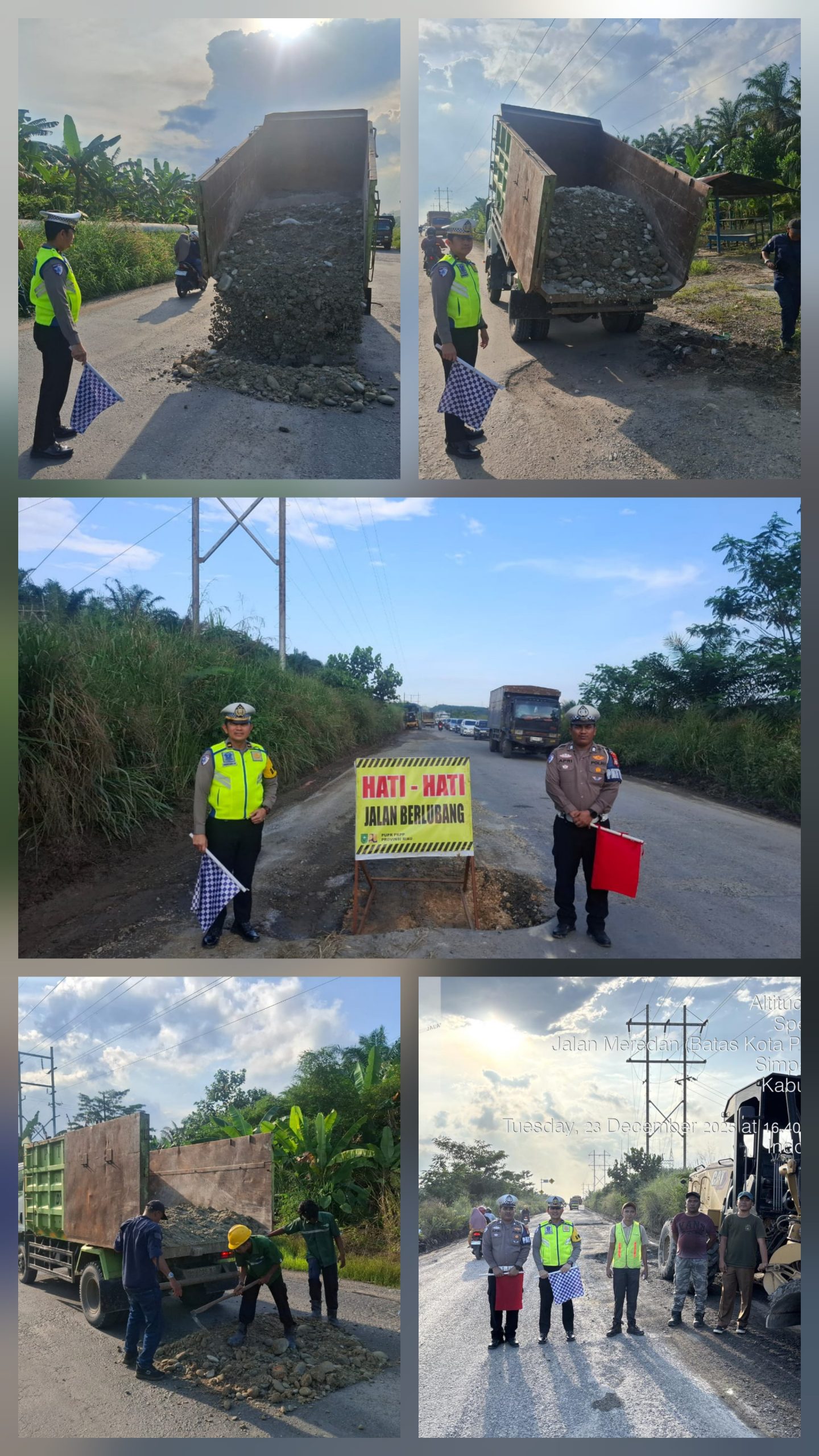 “Kami turun langsung ke lokasi untuk memastikan arus lalu lintas tetap aman dan lancar. Jalan rusak ini cukup berpotensi menimbulkan kecelakaan, sehingga perlu penanganan cepat. Alhamdulillah, setelah kami berkoordinasi dengan Dinas PUPR Provinsi Riau, perbaikan sudah mulai dilakukan,” ujar AKP A. Ramadhan.