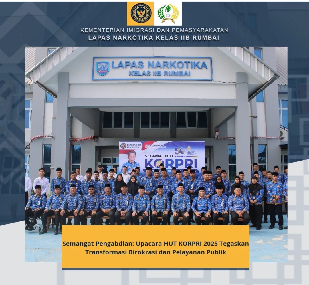 Pekanbaru, Jurnalhukrim.com – Upacara peringatan Hari Ulang Tahun Korps Pegawai Republik Indonesia (KORPRI) ke-54 tahun 2025 berlangsung khidmat di Lapas Narkotika Kelas IIB Rumbai pada Senin (01/12).