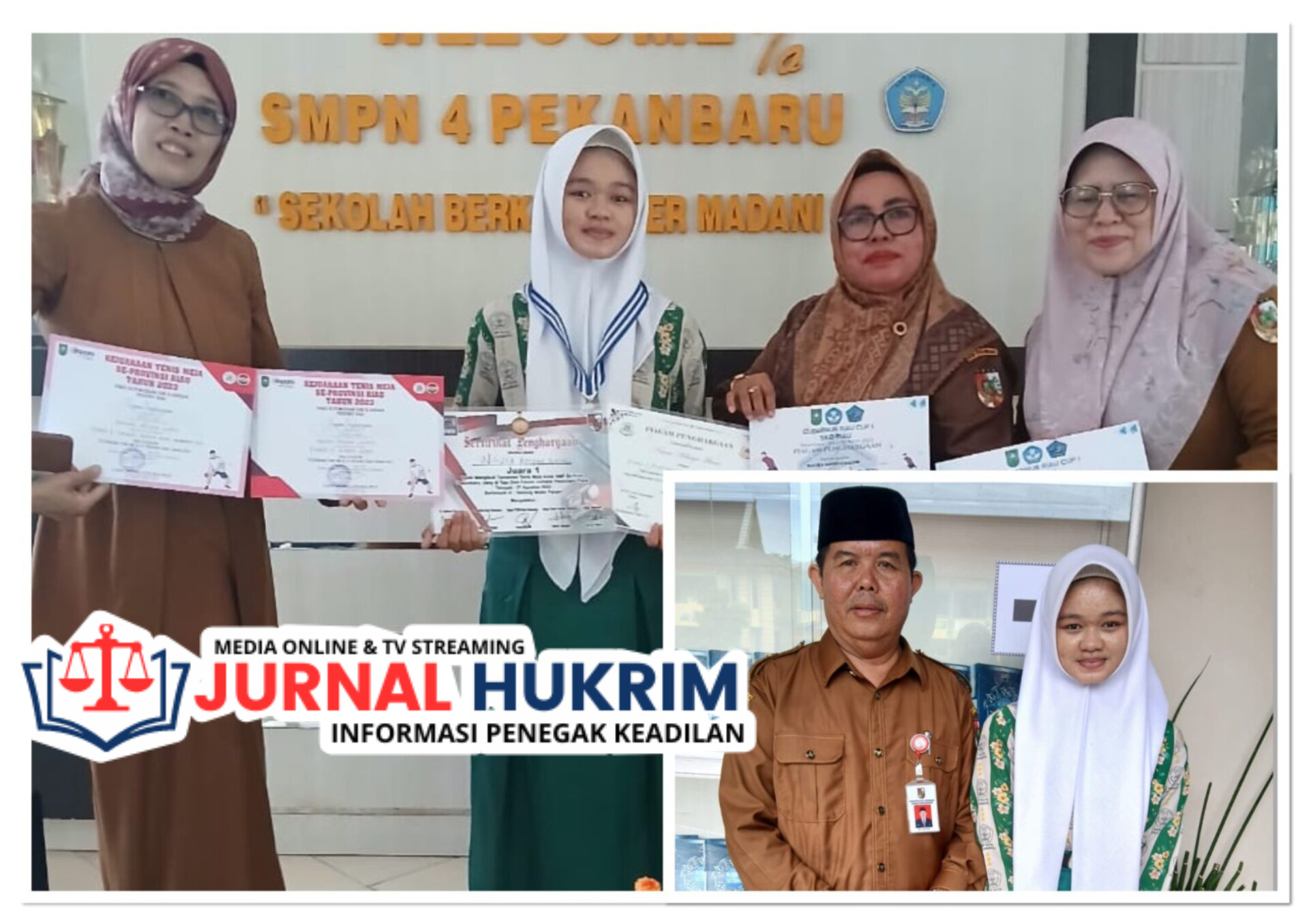 Pekanbaru, Jurnalhukrim.com  – 4 November 2025 — Kepala Sekolah, Kepala Tata Usaha, para guru, serta seluruh siswa-siswi SMP Negeri 04 Pekanbaru dengan penuh kebanggaan memberikan ucapan selamat dan doa terbaik kepada Naura Adhisya Ilham, siswi berprestasi yang akan mengikuti Pelatnas (Pemusatan Latihan Nasional) di Bogor.