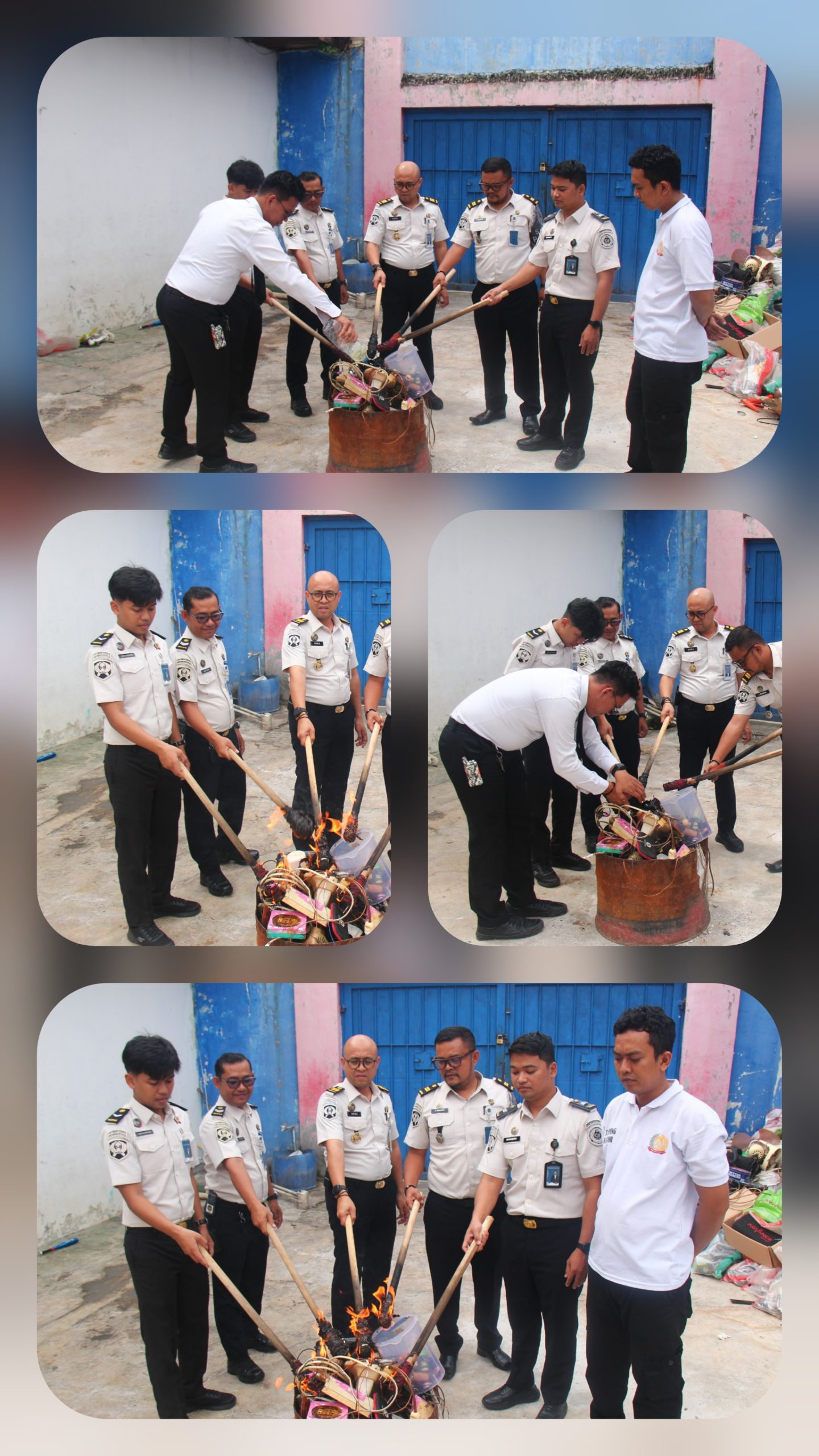 Pemusnahan barang bukti dilakukan terhadap berbagai benda terlarang yang ditemukan saat razia rutin di blok hunian warga binaan, seperti barang-barang yang berpotensi mengganggu stabilitas keamanan dan ketertiban. Seluruh barang bukti dimusnahkan sesuai dengan prosedur yang berlaku guna mencegah penyalahgunaan dikemudian hari.