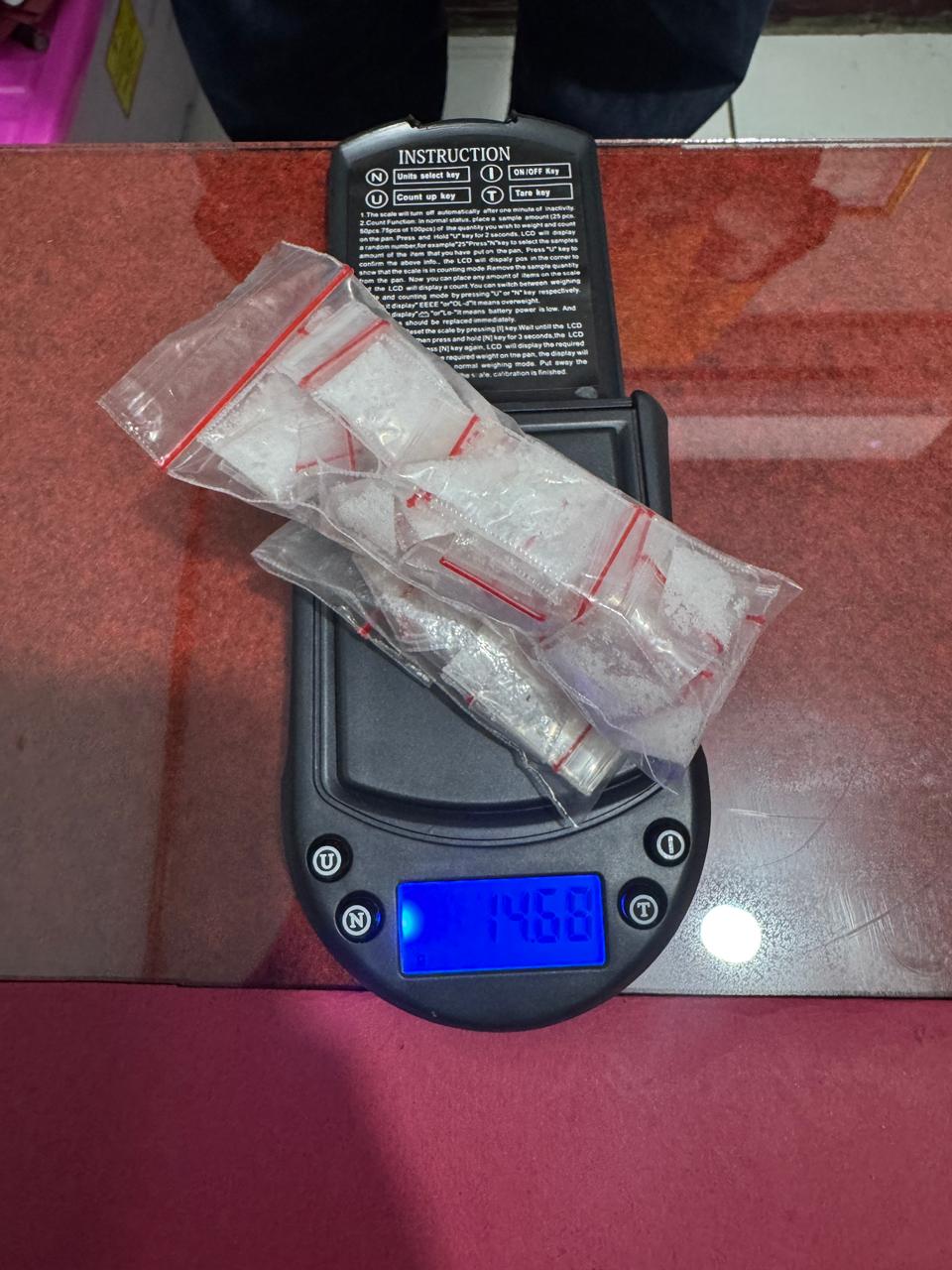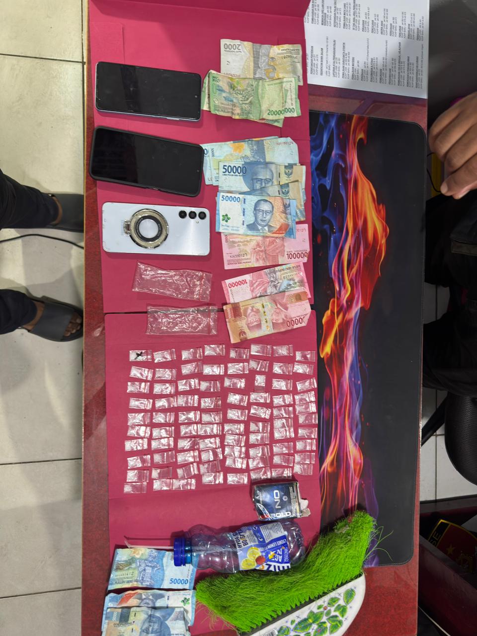 Barang bukti sabu dengan berat kotor 14,68 gram itu ditemukan di saku celana salah satu pelaku serta disembunyikan di dalam sebuah sapu berwarna hijau di dalam ruko. Selain sabu, polisi juga menyita tiga unit telepon genggam dan uang tunai sebesar Rp812.000 yang diduga hasil transaksi narkotika.