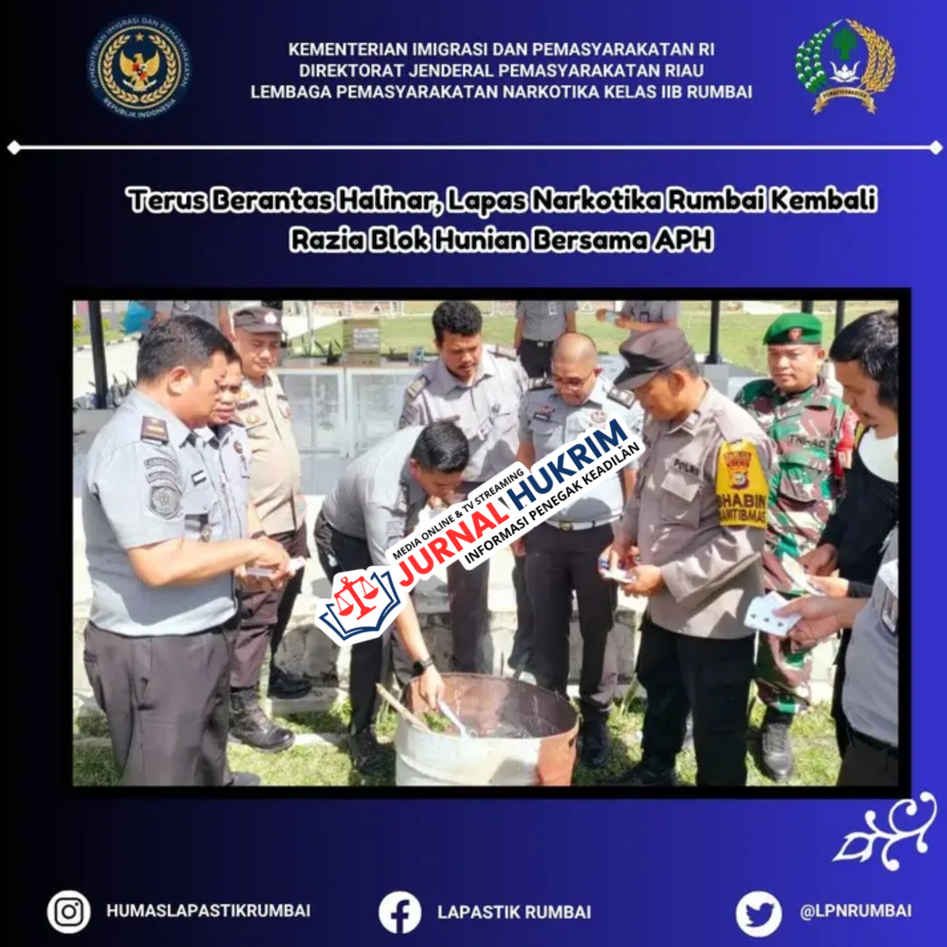 Pekanbaru, Jurnalhukrim.com – Lembaga Pemasyarakatan (Lapas) Narkotika Kelas IIB Rumbai terus tunjukkan komitmennya memberantas peredaran narkoba dan handphone sebagai wujud implementasi Program Akselerasi Menteri Imigrasi dan Pemasyarakatan. Hal ini dibuktikan melalui razia kamar hunian Warga Binaan bersama personel Polri -TNI dan, Senin (03/11/).