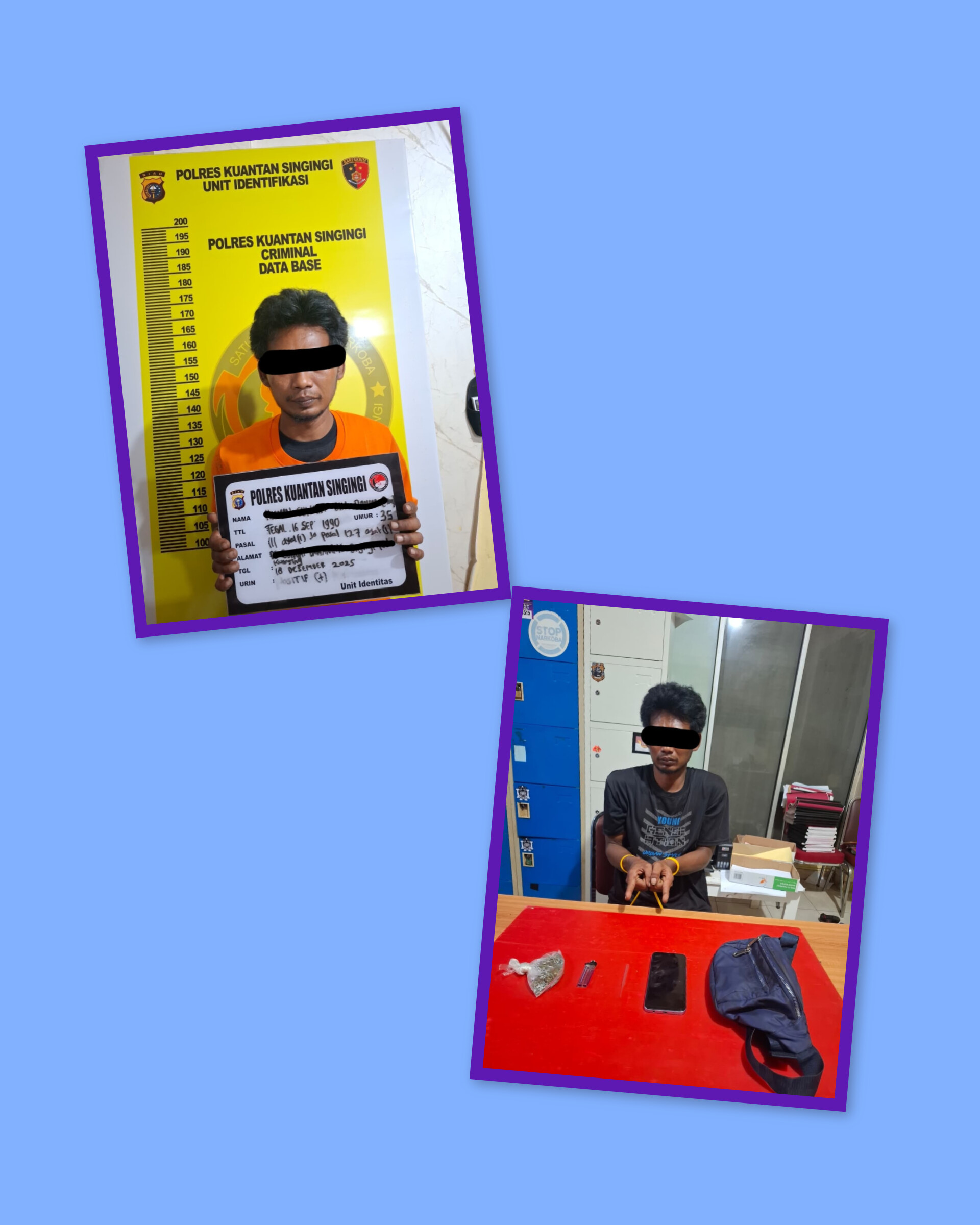 Setelah menerima pelimpahan, Tim Elang Kuantan Sat Res Narkoba melakukan pemeriksaan lebih lanjut dan mengamankan sejumlah barang bukti berupa satu kantong plastik bening berisi daun ganja kering dengan berat kotor sekitar 9,19 gram, satu buah mancis, satu buah kaca pirex kosong, satu unit handphone merek Oppo warna ungu, satu unit sepeda motor, serta satu buah tas warna biru.