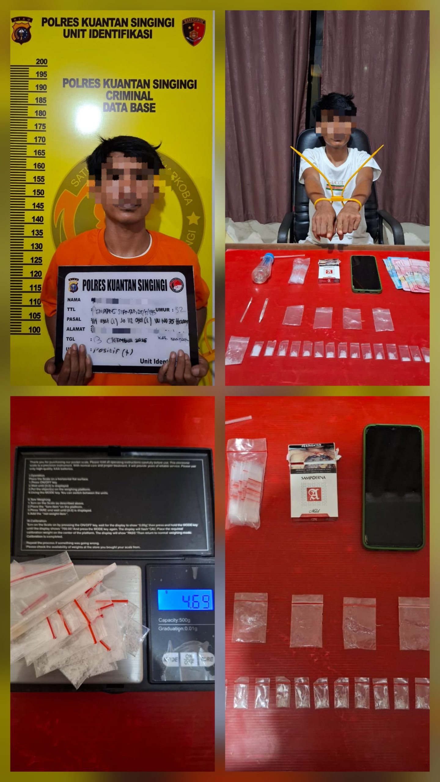 Kapolres Kuantan Singingi AKBP R. Ricky Pratidiningrat, S.I.K., M.H., melalui Kasat Resnarkoba IPTU Hasan Basri, S.H., M.H., mengatakan penangkapan berawal dari penyelidikan tim mata elang Satres Narkoba yang mendapat informasi masyarakat tentang aktivitas mencurigakan di wilayah tersebut. Saat dilakukan pengintaian, tim menemukan seorang pria yang sedang berada di kebun kelapa sawit dan langsung melakukan penggeledahan.