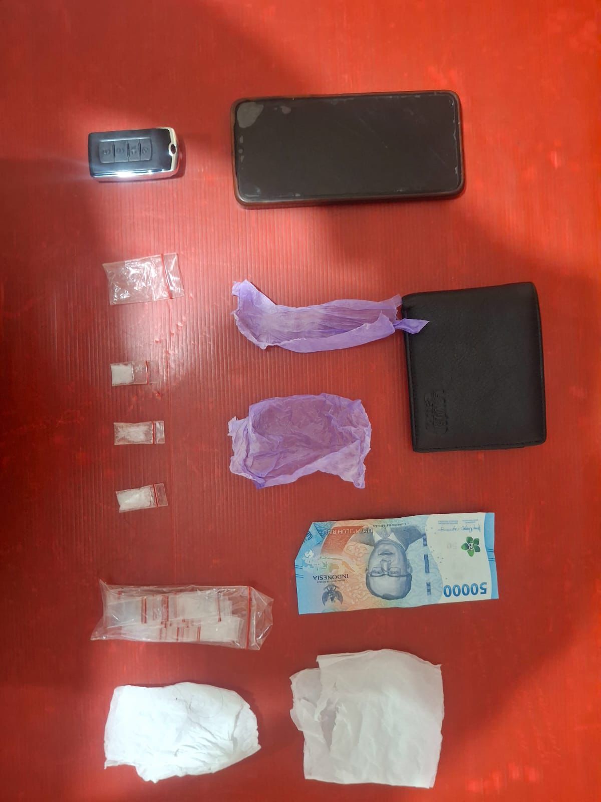 Dari hasil penggeledahan, petugas menemukan satu dompet warna hitam yang di dalamnya berisi tiga paket plastik klip bening berisikan diduga sabu, satu bal plastik klip bening kosong ukuran kecil, satu plastik klip kosong ukuran sedang, satu unit timbangan digital, satu unit handphone OPPO A18 warna hitam, dua lembar tisu, dua plastik warna ungu, dan uang tunai Rp50.000.