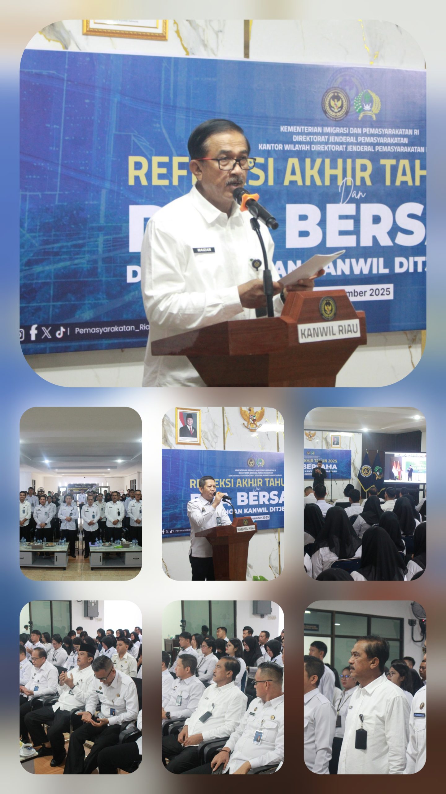 Kegiatan dilanjutkan dengan sambutan Kepala Kantor Wilayah Ditjen Pemasyarakatan Riau, Maizar, yang menekankan pentingnya refleksi akhir tahun sebagai sarana evaluasi atas kinerja yang telah dicapai, sekaligus memperkuat tekad dan semangat untuk menghadapi tantangan di tahun mendatang.